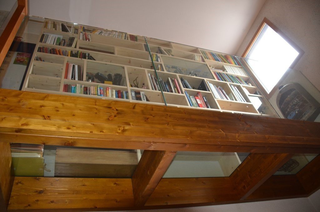 Bibliothèque en épicéa, sur passerelle en verre, avec garde-corps en verre sans cadre