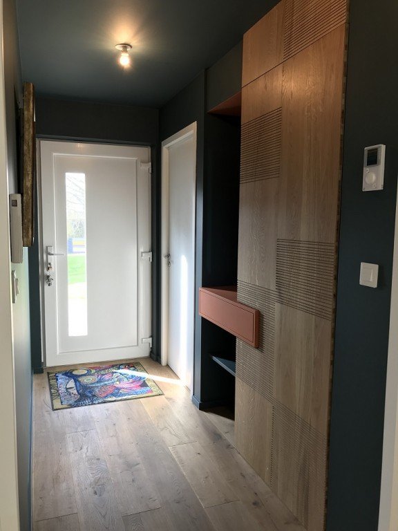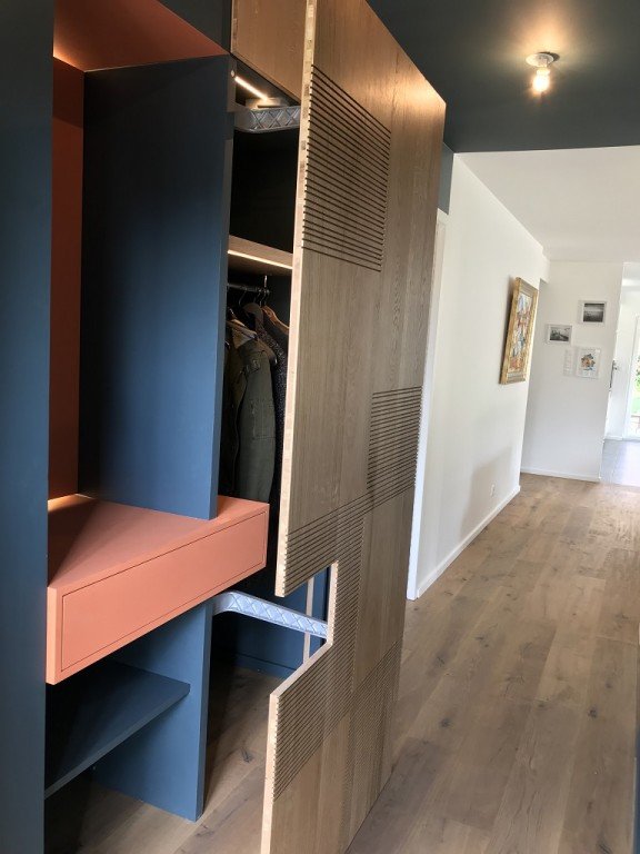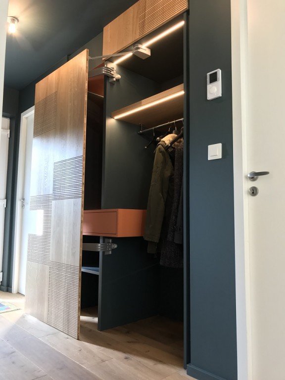 Dressing d’entrée avec tablette et penderie avec porte à rotation déportée et éclairage LED avec allumage automatique.