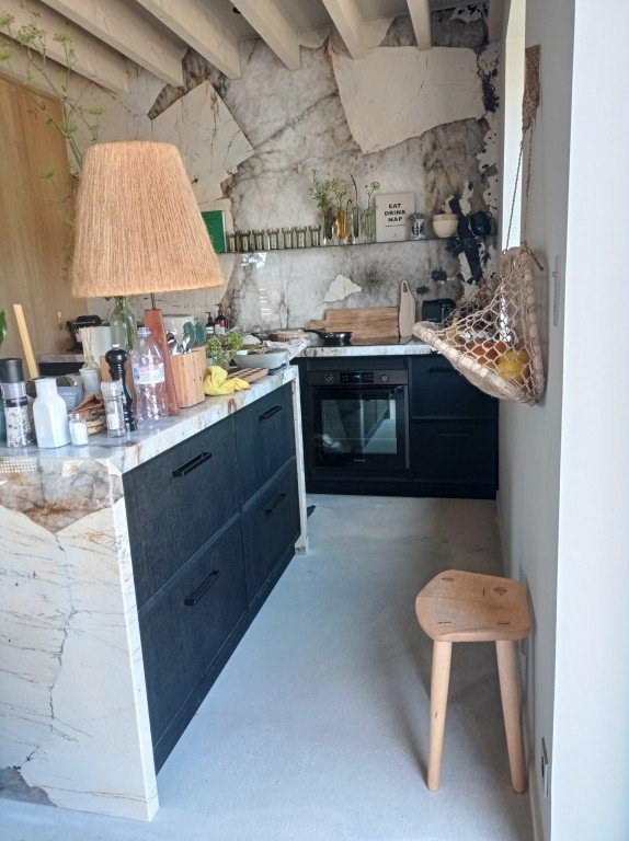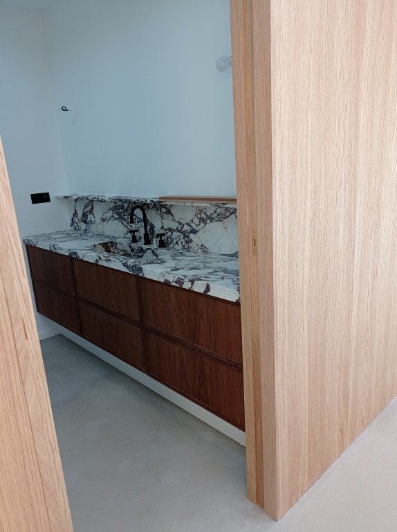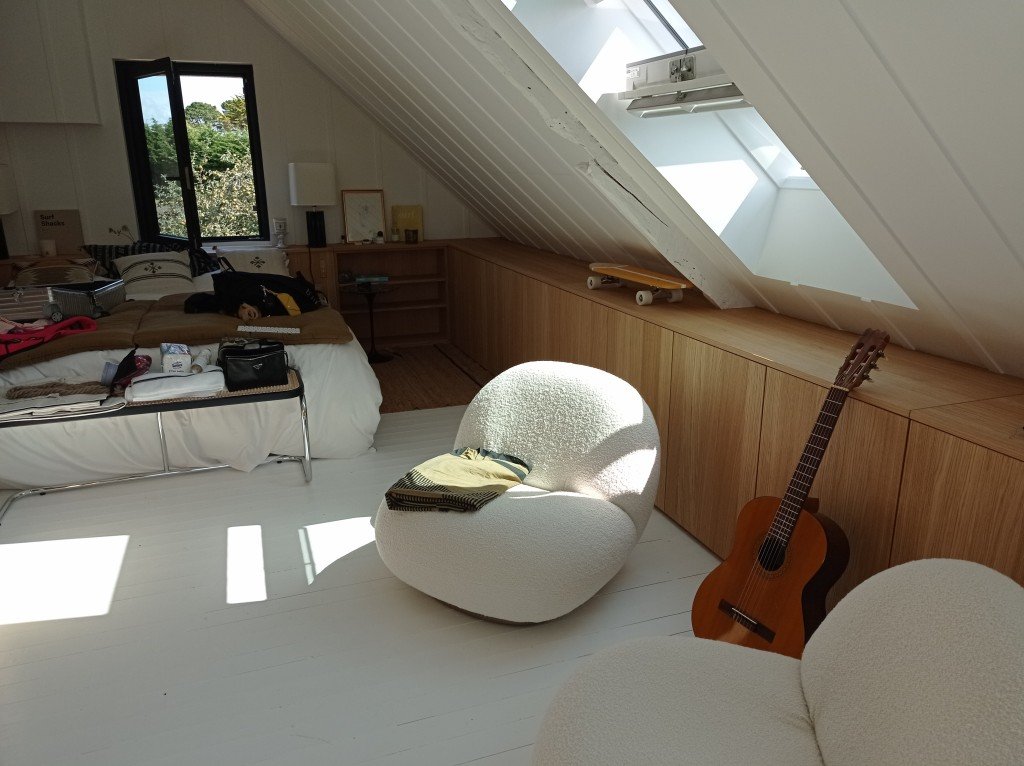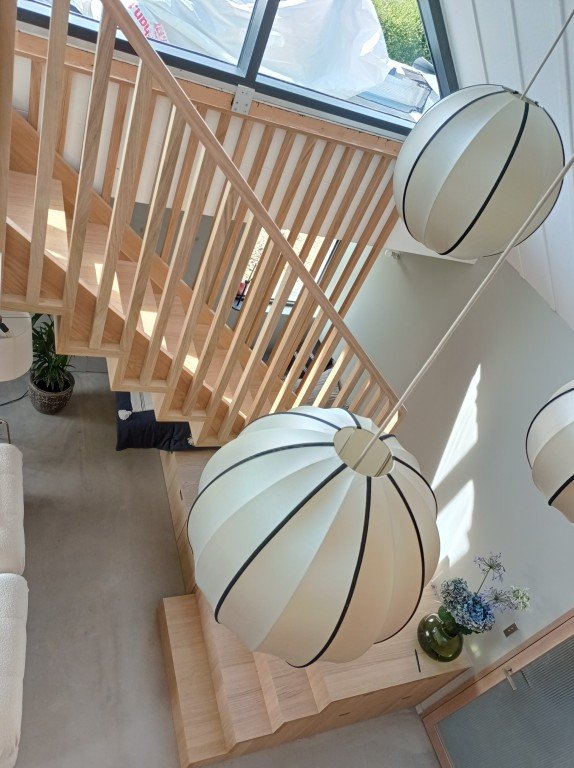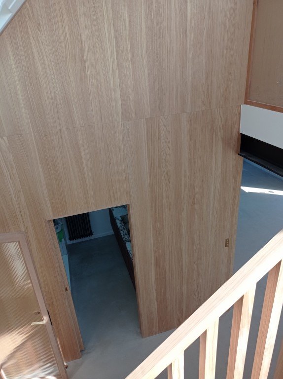 Rénovation complète d’une maison de vacances familiale avec fabrication de l’escalier suspendu et son estrade, habillages muraux, rangements sous combles, fabrication de la cuisine et du meuble de la salle de bain. Le tout en chêne (sauf le meuble de salle de bain qui est en noyer) vernis, et teinté pour la cuisine, Création du cabinet d’architecture Norzh Studio