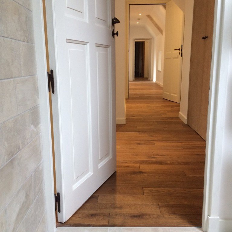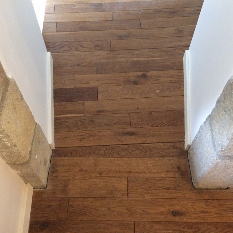 Parquet collé sans barre de seuil au passage de portes.Couloir et chambre en continu.